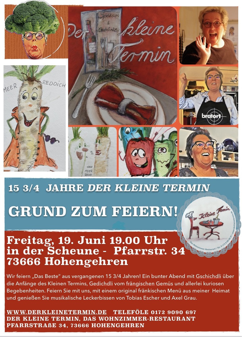 Als Schlemmer und Genießerin liebe ich es, mich von Aromen, Düften und Farben inspirieren zu lassen. Was gibt es Schöneres, als bei einem Streifzug durch die Wiesen den Duft von Blumen in sich aufzusaugen, Kräuter und Pilze zu sammeln und darüber zu sinnieren, welche Köstlichkeiten man daraus zubereiten könnte und wie all diese Leckereien den geeigneten Platz in den Kochtöpfen und Einmachgläsern finden. Es ist eine Leidenschaft von mir, die Stimmungen, Farben und den Geschmack der Jahreszeiten einzufangen und auf das Innere der Stube und meine Küche zu übertragen. Meine Gäste sollen in meinem "Wohnzimmer-Restaurant" in kleiner Runde und heimeliger Atmosphäre schlemmen und genießen können. Mein Wunsch ist es, dass Sie den Geschmack des Kleinen Termins noch lange auf der Zunge behalten, so wie Omas frisch gebackenen Hefezopf. Das Schönste was es für mich gibt, ist Menschen mit einem leckeren Essen glücklich zu machen.