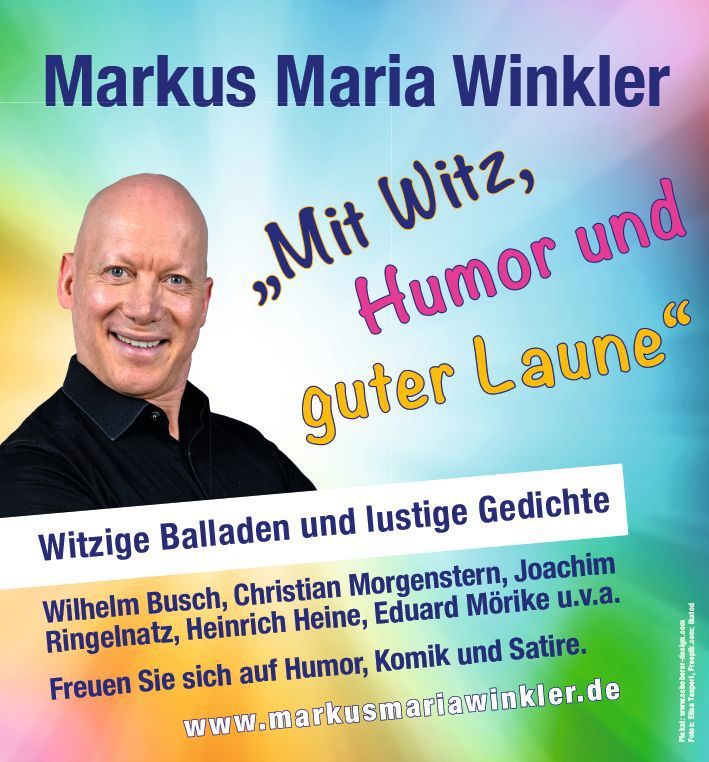 In seinem Programm "Mit Witz Humor und guter Laune" präsentiert der Schauspieler Markus Maria Winkler witzige Balladen und lustige Gedichte von Joachim Ringelnatz, Christian Morgenstern, Wilhlem Busch, Anette von Droste Hülshoff, Manfred Kyber, Heinrich Heine, Theodor Fontane, Marie von Ebner-Eschenbach, Hoffmann von FAllersleben, Eduard Mörike, Fred Endrikat, Friedrich von Schiller, und Johann Wolfgang von Goethe. Gewürzt wird sein amüsantes Programm mit heiteren Anekdoten über die Literaten.